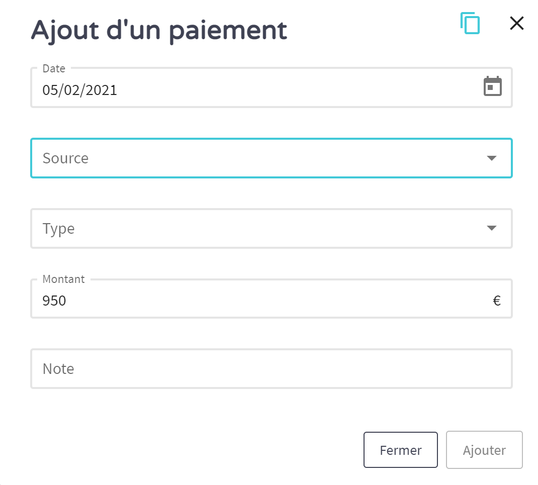 4. Indiquez source "externe", le montant du paiement que vous avez reçu et une note si nécessaire.